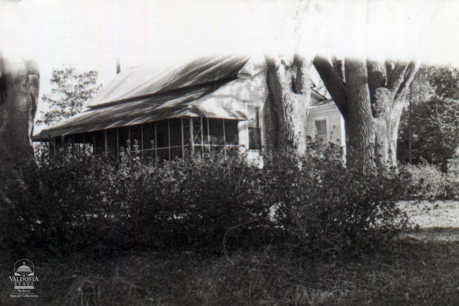 Georgia Architectural and Historic Properties Survey of Rural [007] Southeast Brooks Co., Ga. December 1980. One story house of rectangular plan. Gabled, tin roof. Shed (screened) porch. Square posts. Shiplap siding. Double hung sash windows with 2/2 lights. Exterior chimney. Set on brick piers. Large live oak trees out front. Date of Construction: c. 1910. Typical rural house common to Brooks Co. area.