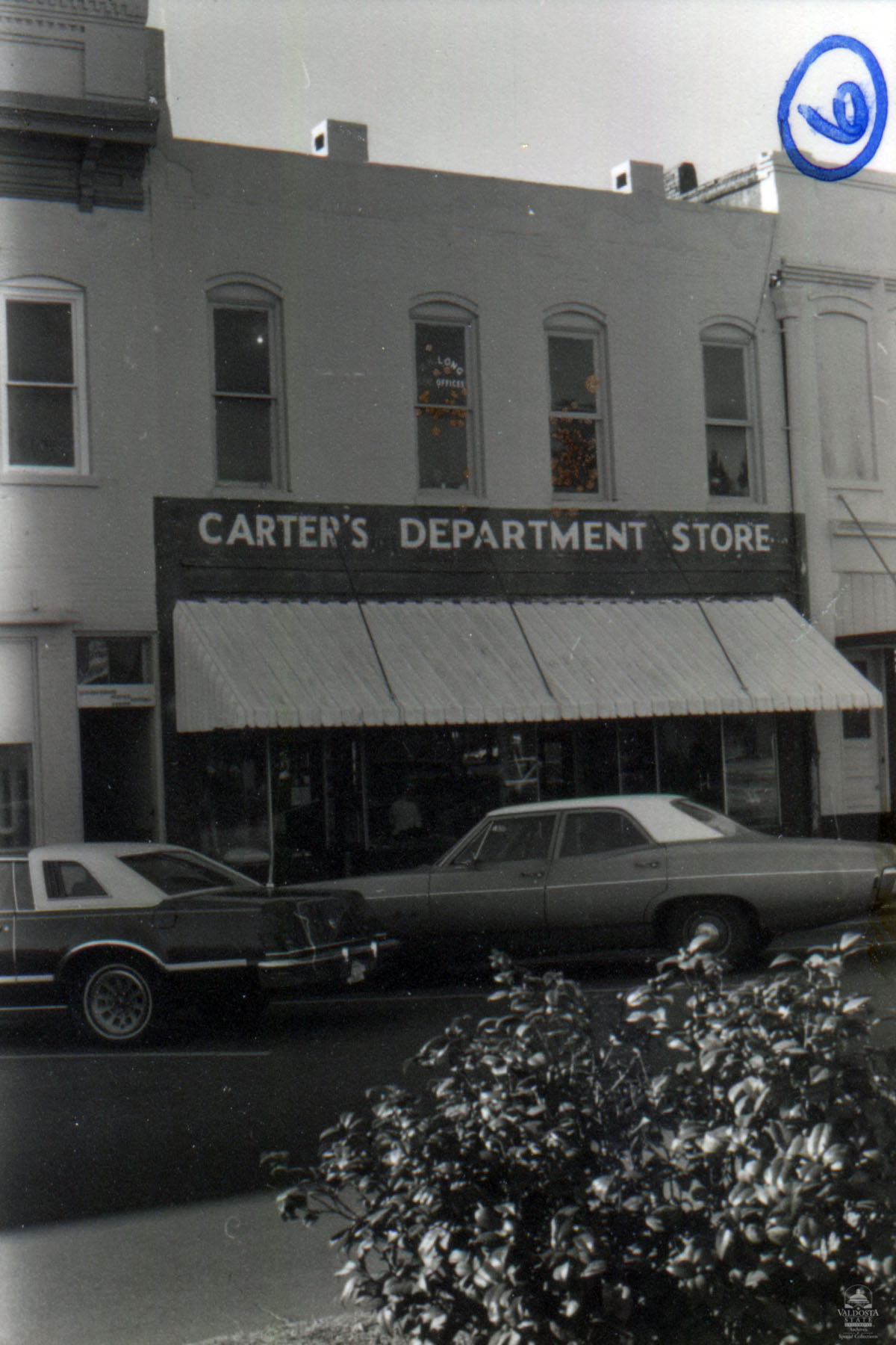 Georgia Architectural and Historic Properties Survey of Carter Department Store, 205 E. Screven St., Quitman, Brooks County, Ga., 1981. Dept. store and offices upstairs. Two story brick building of rectangular plan. Flat roof. Segmented arched windows (1/1 lights) on second floor. Two entrances, each doorway set in an alcove with display windows. Fair condition. Date of Construction: 1895. 1895 - grocery store. 1899 - J.O. Lewis Hardware. 1900 - grocery & Masonic Hall on second floor. 1912 - grocery. Significant as part of a potential National Register district, a downtown district of mostly 19th century buildings along Screven St.