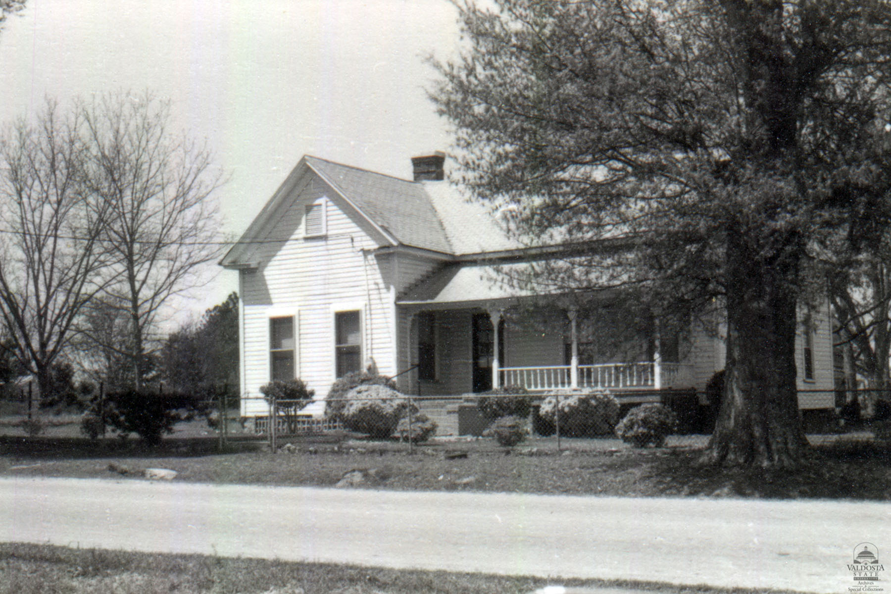Georgia Architectural and Historic Properties Survey of Dasher St. [10], Sycamore, Turner County, Ga., 1981. Georgian plan house with gabled roof with returns. Shed porch supported by turned spindle posts decorated with gingerbread brackets and turned spindled balusters. Wood shingle siding. Double sash aluminum windows. Interior chimney. Transom over door. Brick piers. Good condition. Date of Construction: c. 1910. Not significant as part of a potential National Register historic district. Area of older structures not extensive enough.