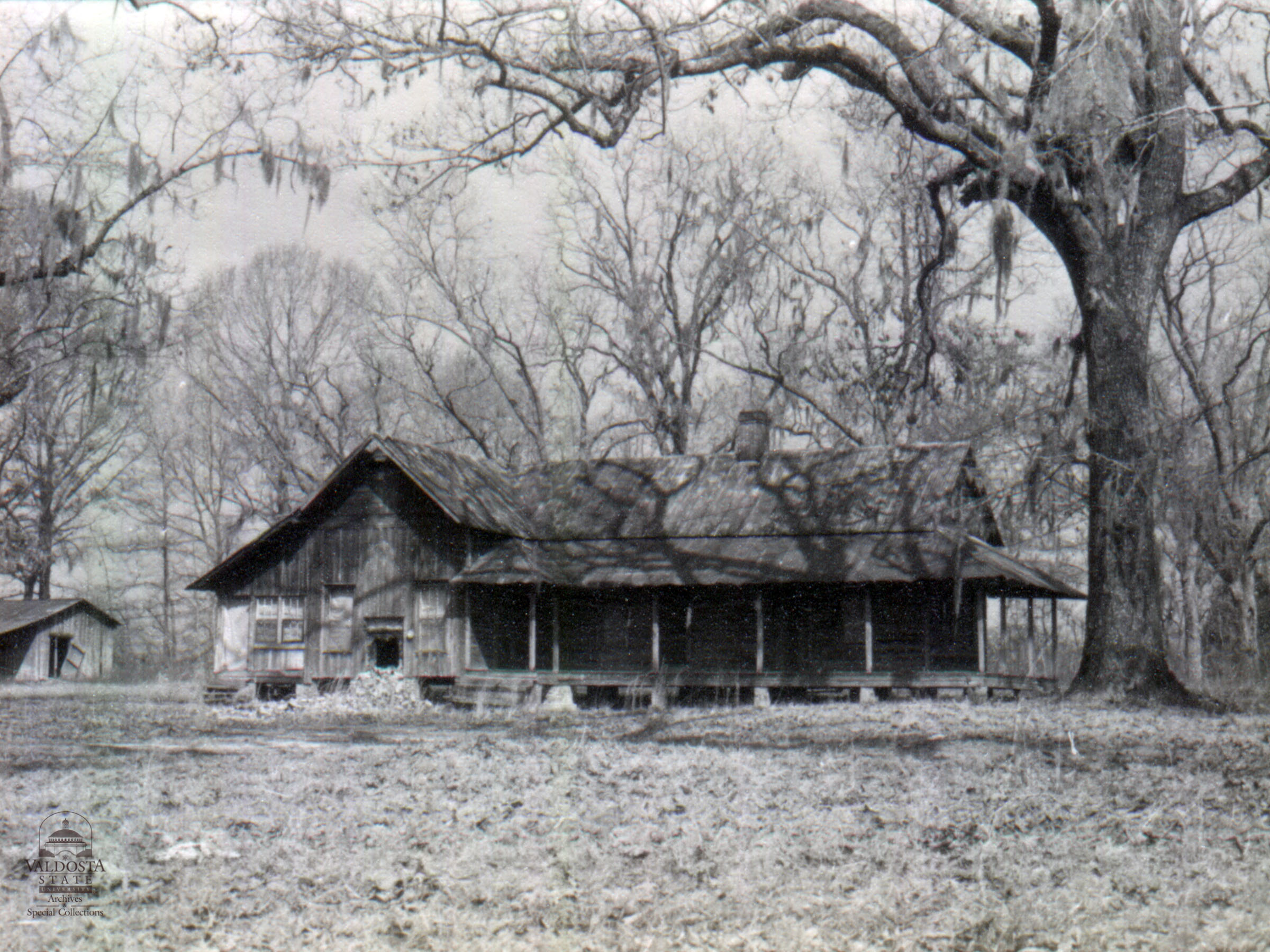 Georgia Architectural and Historic Properties Survey of Rural [266] Southeast section of the county, Valdosta, Ga. December 1980. One story L-shaped saddlebag house with addition at left. Gabled, tin roof. Shed porch with square posts. Clapboard siding and board and batten. Sash windows with 6/6 lights. Small smokehouse in front and outbuildings in rear. Part of River Bend Plantation. Poor condition - deteriorated. Date of Construction: c.1890. Typical farmhouse for a small farm, very common to the entire Brooks County area.