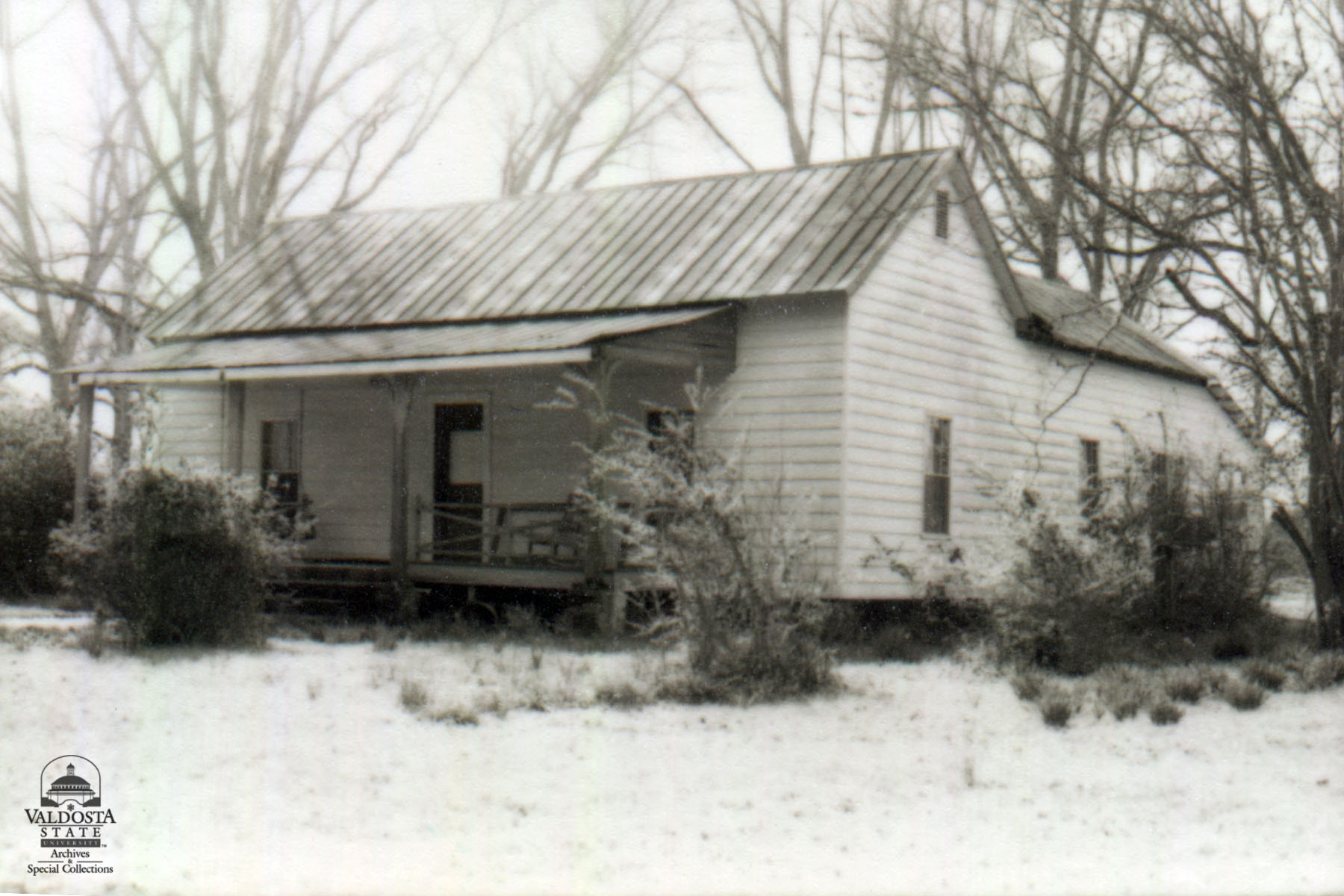 Georgia Architectural and Historic Properties Survey of Rural (Pidcock) [222] South west section of the county, Quitman, Ga. December 1980. A one story rectangular plan with gabled tin roof and asbestos siding. Shed porch and square posts. Sash windows with 6/6 lights, interior chimney. Brick piers. Fair condition. Date of Construction: c. 1910. A typical rural vernacular house, common to this area.