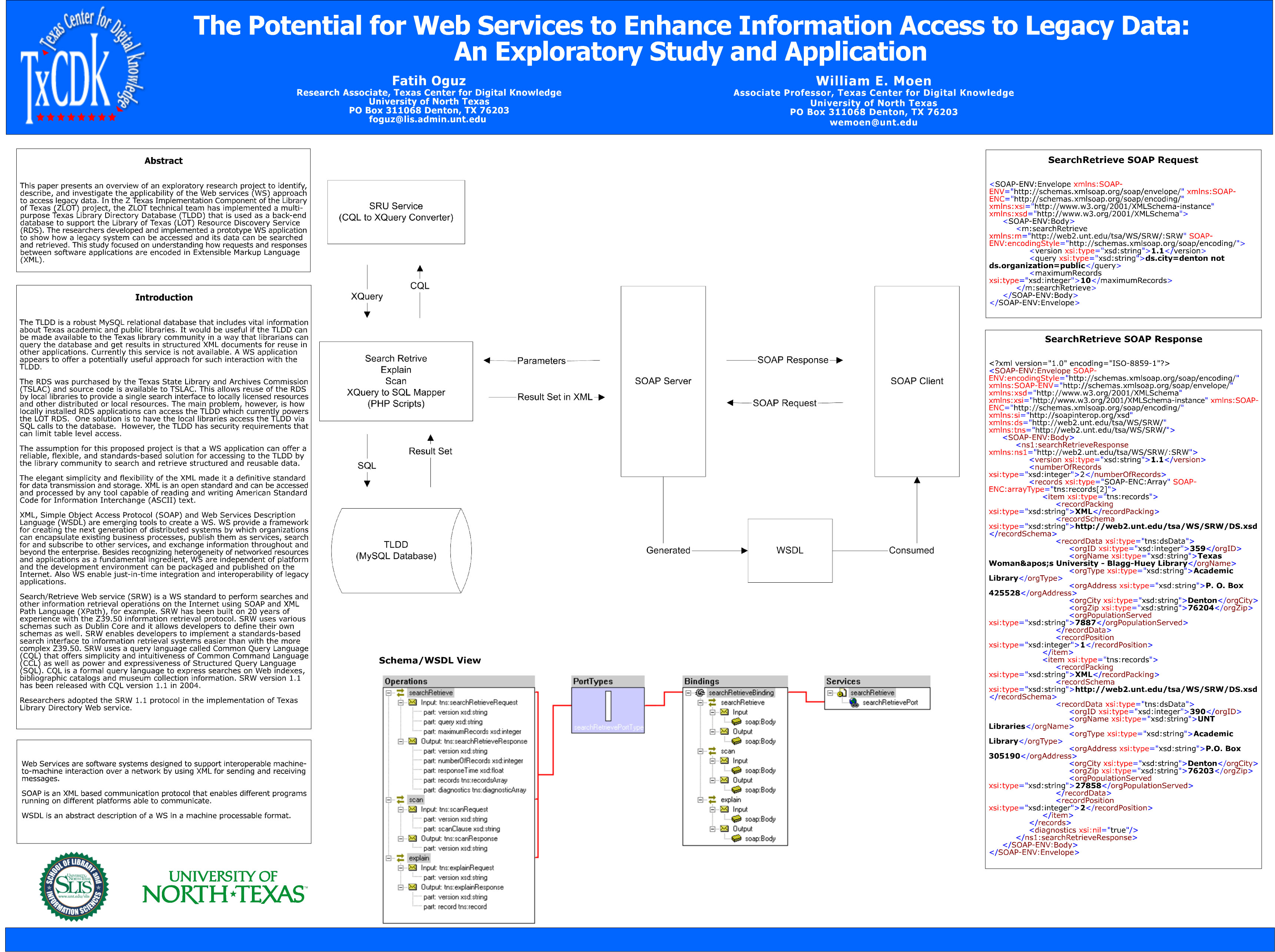Oguz, F., & Moen, W. E. (2006, January). The Potential for Web Services to Enhance Information Access to Legacy Data: An Exploratory Study and Application. Poster presented at the 2006 Annual Meeting of the Association for Library and Information Science Education, San Antonio, TX.