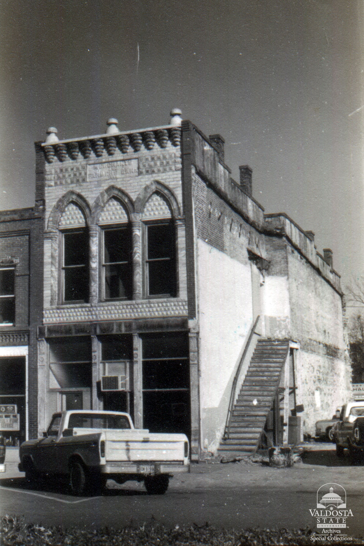 Georgia Architectural and Historic Properties Survey of Quitman [338] 312 E. Screven, Valdosta, Ga. December 1980. Merchants & Farmers Bank. Slim, two story rectangular plan building. Flat roof. Brick. Granite facade (which has been replaced with modern structures on 1st floor) textured. An arcade of 3 pointed arched windows with pilasters. Date of Construction: c. 1898. Second bank to be organized in Quitman. Opened for business in April 1891. Dr. James McCall was the first president. The bank was located first in the Opera House (what is now City Hall) until this building was completed in 1898. In 1905, the bank went national and was renamed First National Bank. Since the bank left, the building has been used as a law office, a savings banks, and farmer's mutual. Significant as part of a potential National Register district, a downtown district of late 19th and early 20th century buildings.