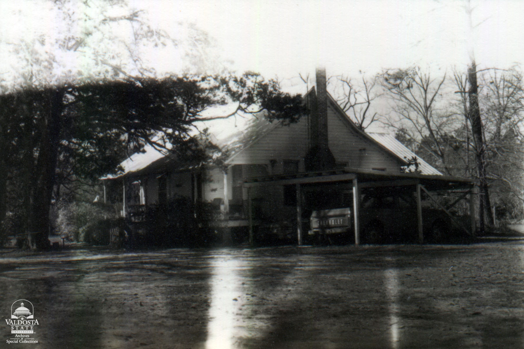 Georgia Architectural and Historic Properties Survey of Rural [022] Unknown, Quitman, Ga. December 1980. A one story rectangular plan with Louisiana style gabled tin roof. Shed porch with turned spindle posts, gingerbread trim. Sash windows with 6/6 lights. Interior chimney, brick piers. Fair condition. Date of Construction: c. unknown. A typical vernacular house common in this rural area.
