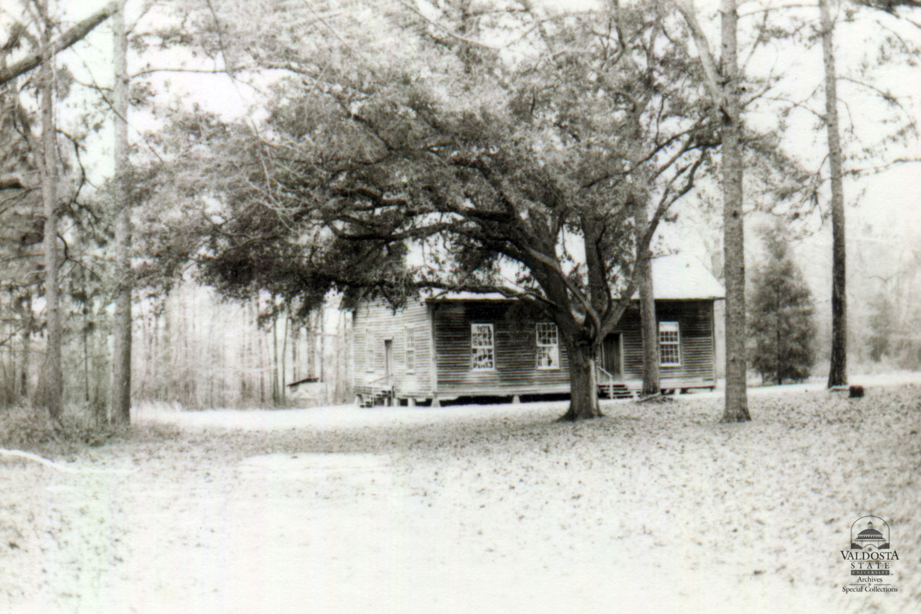 Georgia Architectural and Historic Properties Survey of Rural [295] Unknown, Valdosta, Ga. December 1980. A one story rectangular plan with gabled tin roof and unpainted clapboard siding. Sash windows with 12/12 lights. Entrances on either side. Now set on concrete piers. Date of Construction: c. 1834. A typical rural church common in rural Brooks County.