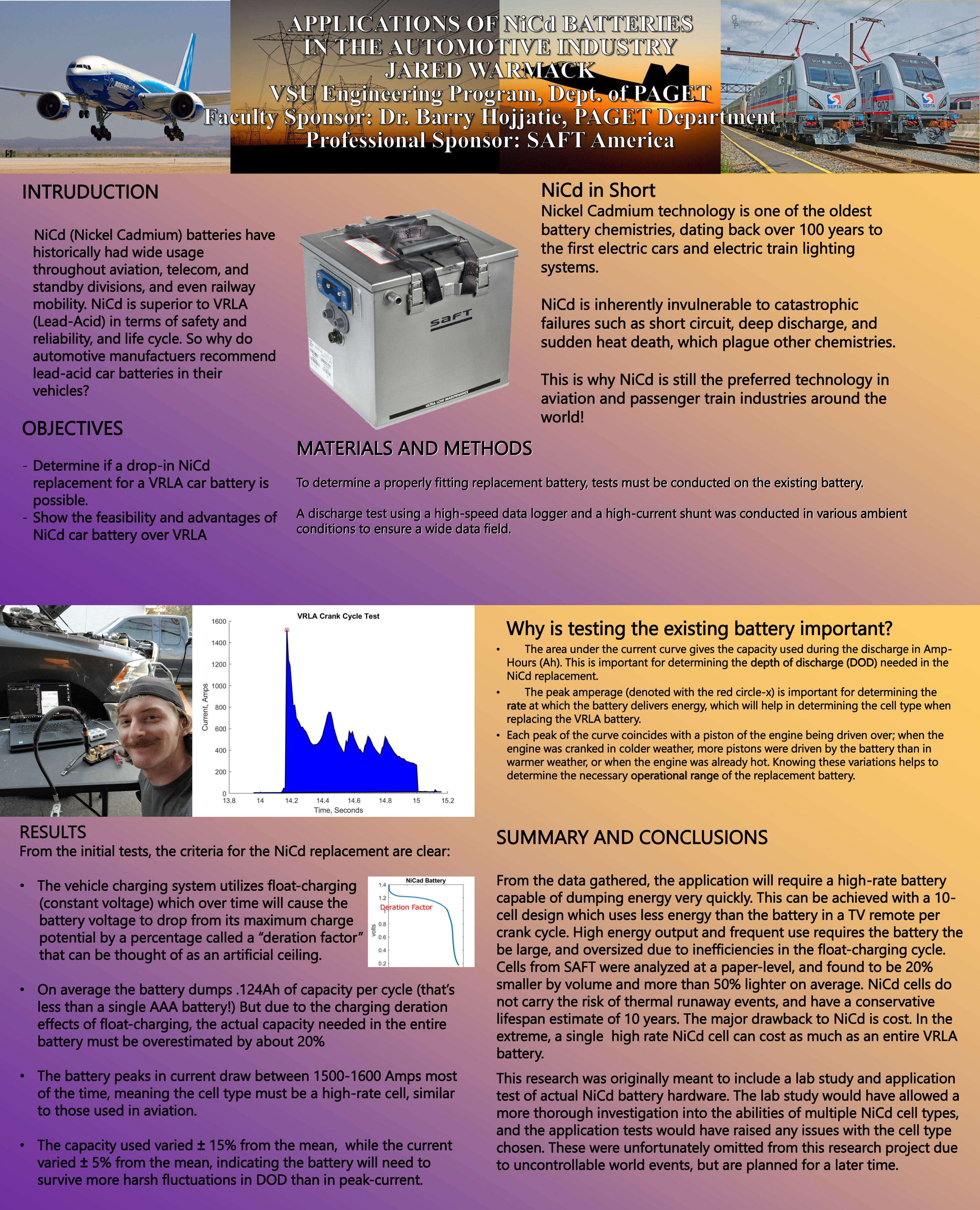 For decades Lead Acid batteries have been used in consumer and commercial vehicles as engine starter power sources, and backup power. Nickel-Cadmium technology offers longer life, fewer failure scenarios, better energy density, and better power to weight ratios than lead acid batteries, and with proper maintenance can last over 20 years. This project will consist of hypothesizing, designing, building, and testing a “drop-in” Ni-Cd battery for a Ram 2500 truck with a 6.7 liter Cummins engine. This proof of concept design will test the validity of Ni-Cd batteries in the heavy-duty truck and heavy-machinery market, comparing design chemistry, cost to market, maintenance, and battery lifetime.