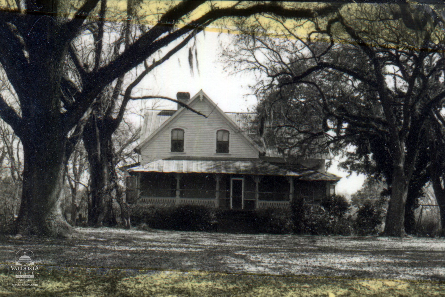 Georgia Architectural and Historic Properties Survey of Rural [243] Southern section of the county, Valdosta, Ga. December 1980. A one story rectangular plan with multi-gabled tin roof and clapboard siding. Surrounding hip porch with carved posts and gingerbread. Segmented arched windows with 2/2 lights, interior chimney, brick piers. 3 sided bay at left. Fair condition. Date of Construction: n/a. A typical rural farmhouse common to these rural areas of Brooks County.
