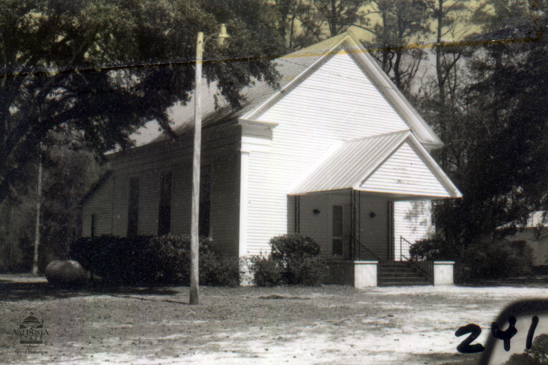 Georgia Architectural and Historic Properties Survey of Rural [241] Southern section of the county, Valdosta, Ga. December 1980. A one story rectangular plan with gabled roof and clapboard siding. Gabled porch, large sash windows with 9/9 lights. Brick piers. Double doors. Good condition. Date of Construction: c. 1910. A typical rural church common to this area.