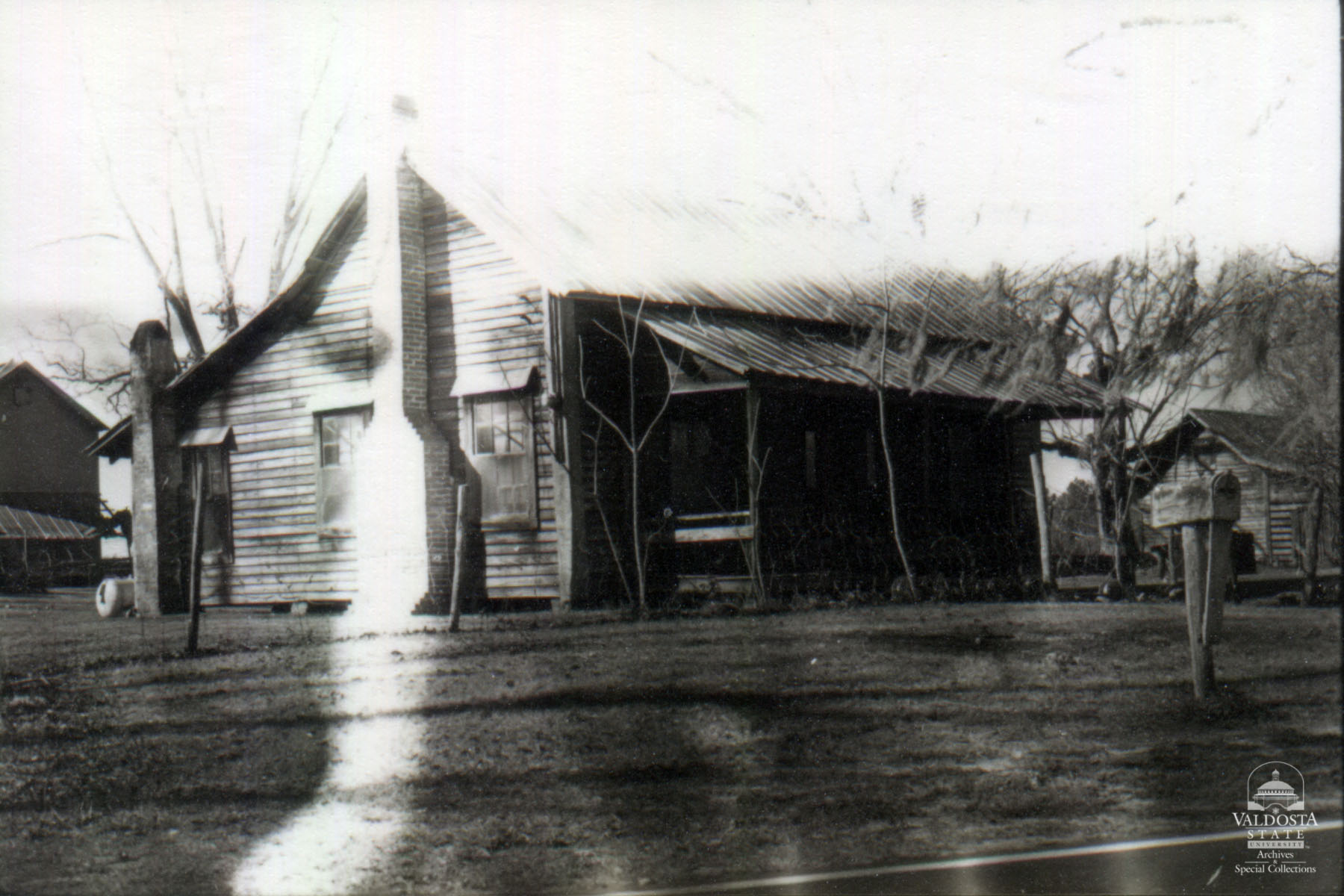 Georgia Architectural and Historic Properties Survey of Rural [009] N. East Brooks Co., Ga. December 1980. One story house of rectangular plan. Gabled tin roof. Shed porch. Square posts. Unpainted clapboard siding. Double hung sash windows with 6/6 lights. Sidelights. Various shed outbuildings. Was once a dogtrot. Fair condition. Date of Construction: c. 1900. Typical rural farmhouse common to Brooks Co. area.