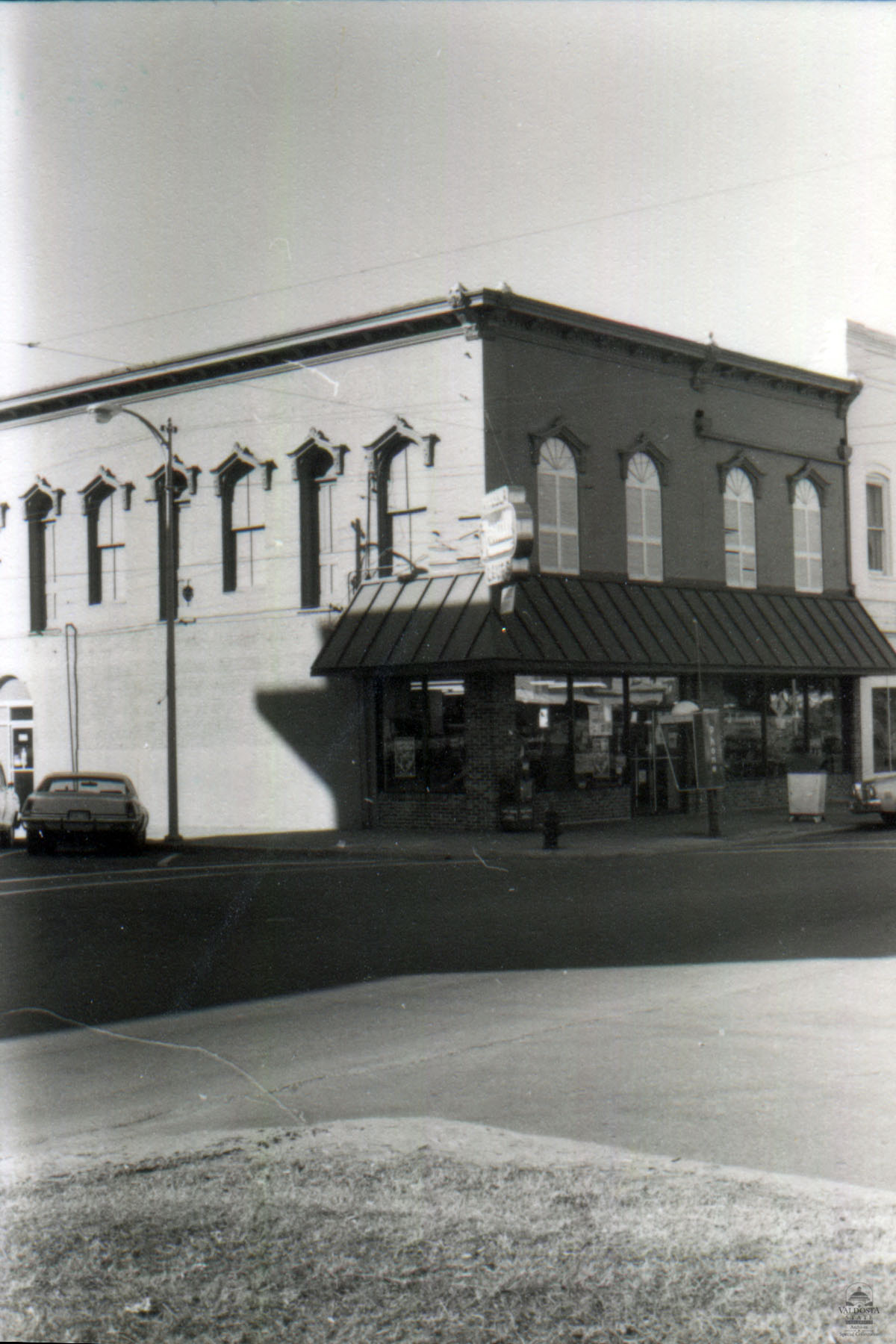 Georgia Architectural and Historic Properties Survey of Maddox Drug Store, 215 E. Screven St., Quitman, Brooks County, Ga., 1981. Two story rectangular building. Flat roof. Red brick. Cast iron cornice with brackets along parapet. Arched shuttered windows, with cast iron decorative pediments. Modernized street floor. Once had a balcony on 2nd story because there are doors on the 2nd floor at the east side of the building. Good condition. Drug store and offices were upstairs. Date of Construction: Prior to 1889. Built for use as a drug store by Sweat family. However, it was owned by the Avera's and used as Avera's Drug Store. The Avera's are one of Quitman's oldest and most prominent families. Mr. Maddox knows that the building was built between 1864 and 1889 because there was nothing there in 1864. All newspapers saved during this era were burned in a fire. Offices upstairs - (known) Dr. Donaldson, dentist. Dr. Dorough, a GP. Significant as part of a potential National Register district, a downtown commercial district of late 19th and early 20th century buildings.