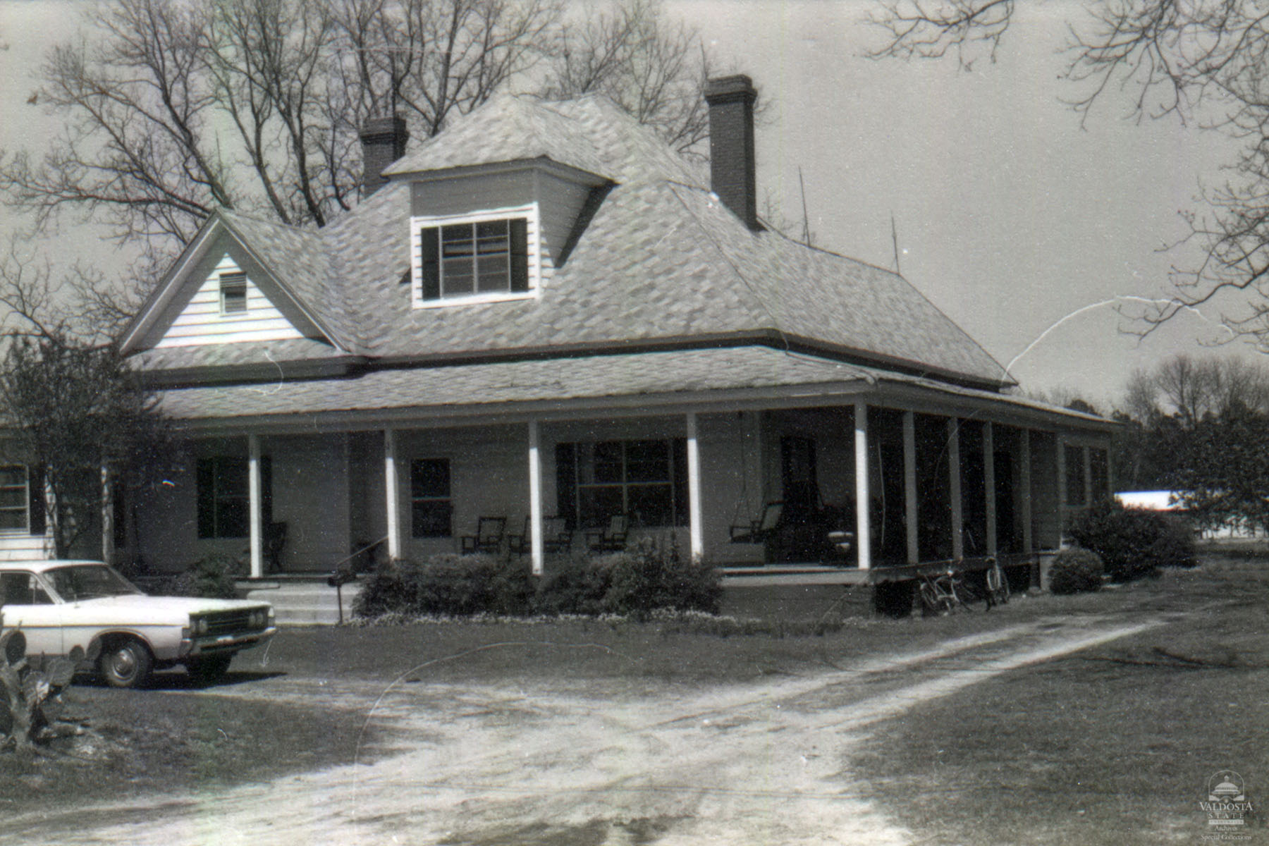 Georgia Architectural and Historic Properties Survey of [Unknown Address 1], Sycamore, Turner County, Ga., 1981. Georgian plan house with hipped roof and pedimented gable on left front and hipped dormers centered on front and back. Shed porch surrounds front and right side and is supported by square posts. Siding is aluminum with ornamental shutters. Aluminum double sash windows with 2/2 lights. Interior chimneys. Brick piers. Good condition. Date of Construction: c. 1910. Not significant as part of a potential National Register historic district. Area of older structures not extensive enough.