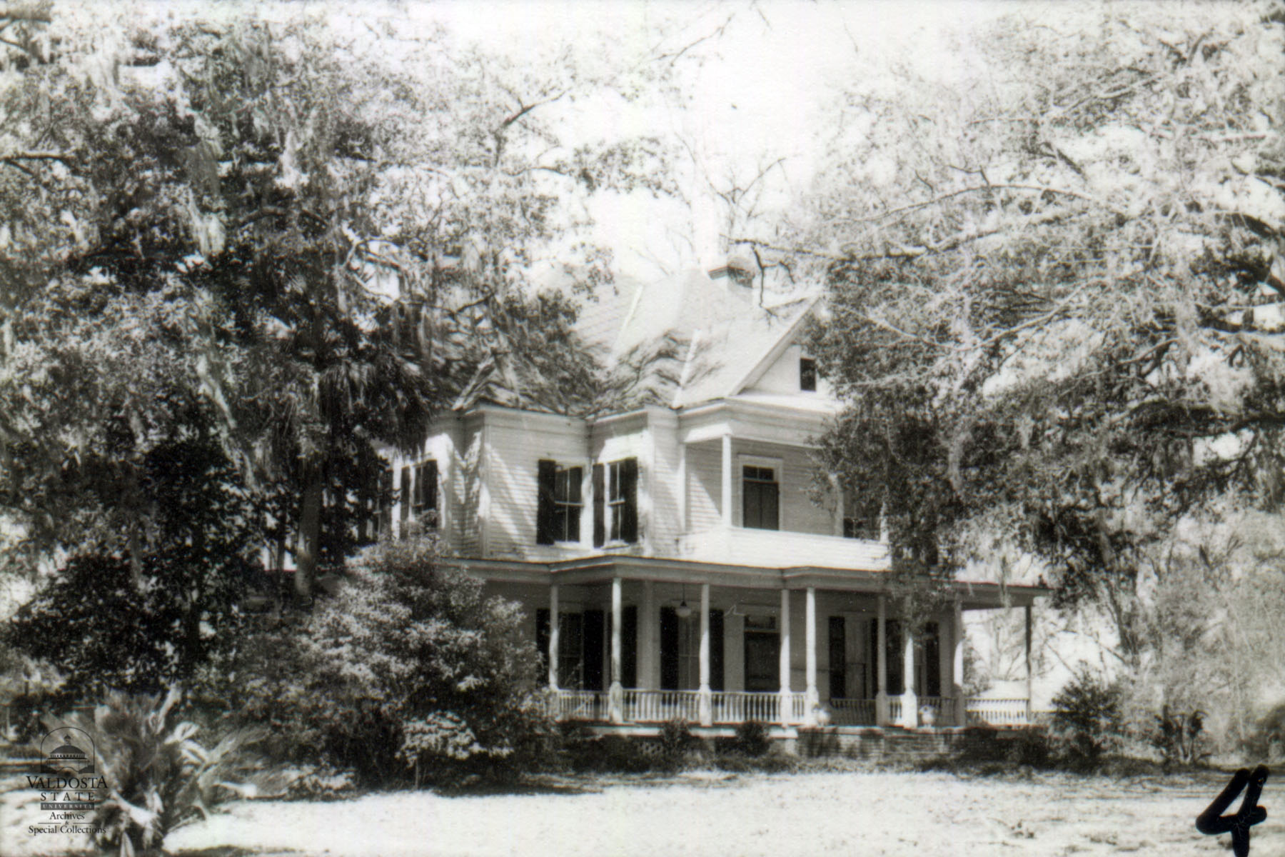 Georgia Architectural and Historic Properties Survey of Quitman [298] Highway 221, south of Quitman (just out of city limits), Valdosta, Ga. December 1980. Two story house of irregular plan. Hipped, gabled roof. Surrounding shed porch with turned spindle posts. Clapboard siding. Sash windows with 2/2 lights. Shutters. Transom over door. Interior chimney. Set on brick piers. Second story central balcony. Set in a grove of oak trees. Good condition. Date of Construction: c. 1890. Very nice example of a turn of the century country house.