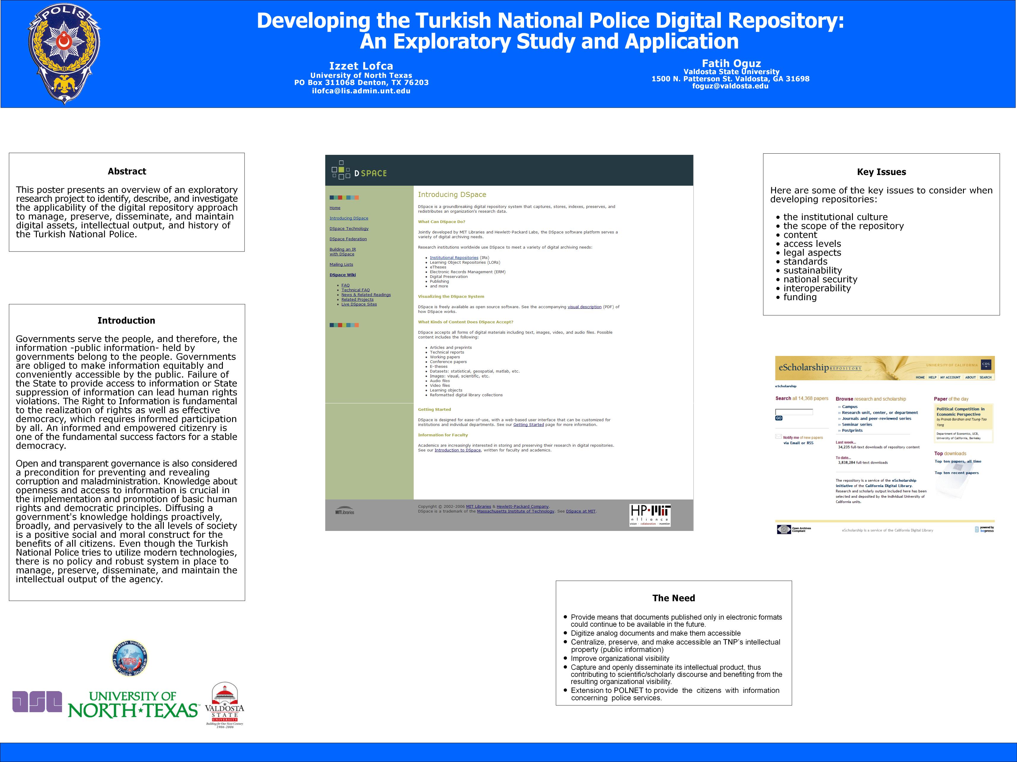 Lofca, I. & Oguz, F. (2006, October). Developing the Turkish National Police Digital Repository. Poster presented at the Annual Meeting of the American Society of Criminology (ASC), Los Angeles, CA.