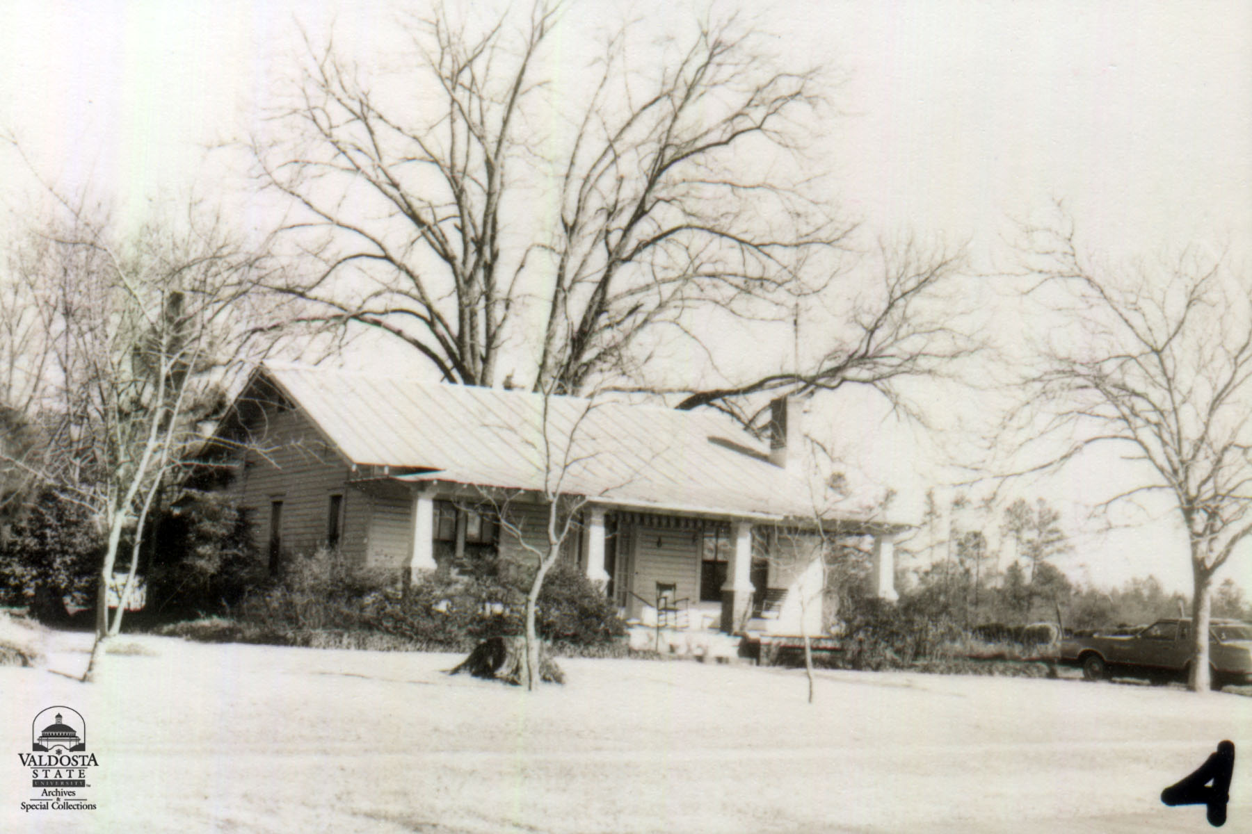 Georgia Architectural and Historic Properties Survey of Rural [128] Mid west section of the county, Quitman, Ga. December 1980. A one story rectangular plan with gabled roof, exposed rafters and brackets. Shiplap siding, shed porch with square posts. Interior chimney. Sash windows with 6/6 lights. Sidelights. Good condition. Date of Construction: c. 1920. A typical vernacular house common in these rural areas.