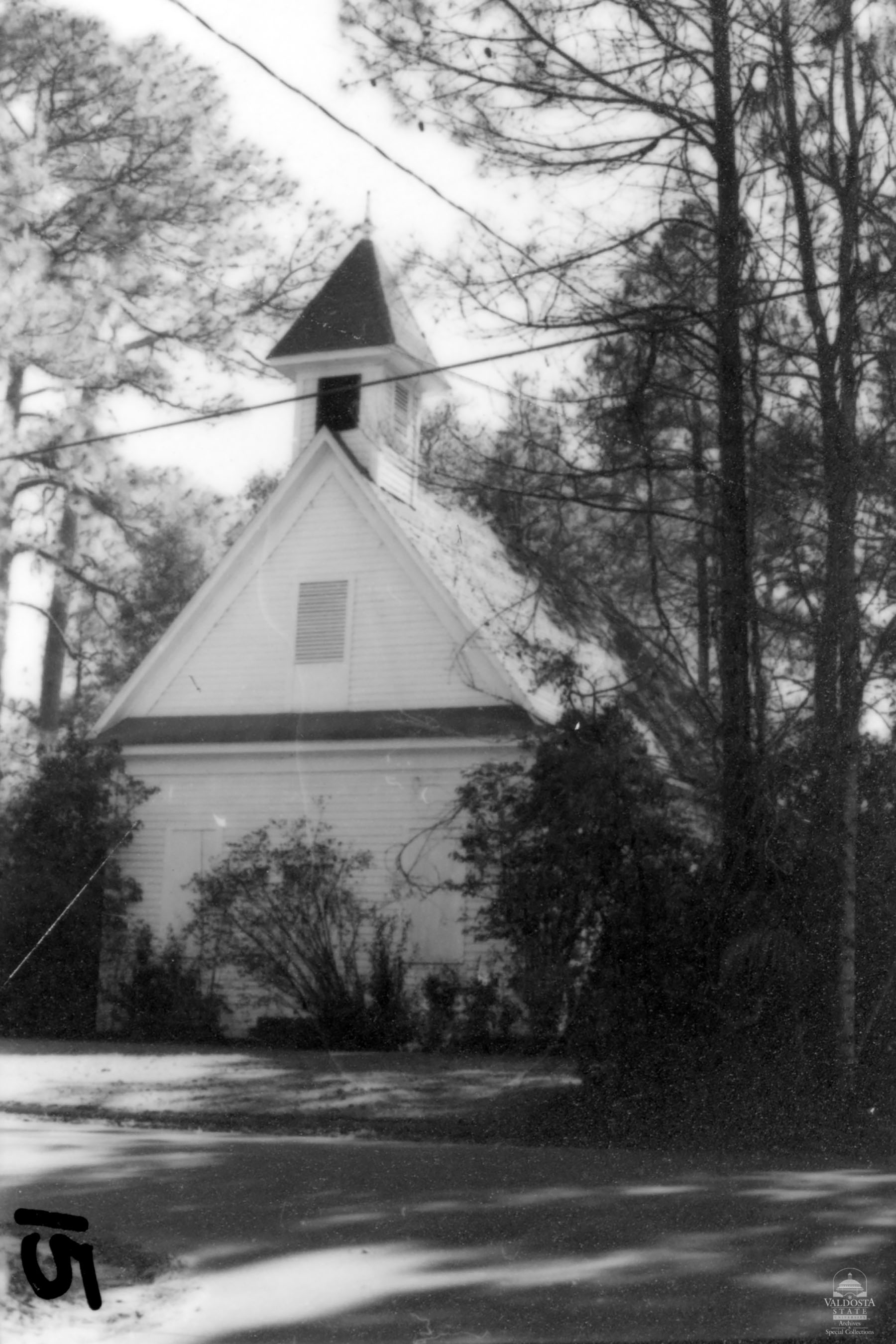 Georgia Architectural and Historic Properties Survey of Railroad Street Church, Quitman, Brooks County, Ga., 1981. Small rectangular plan church with gabled roof. Shiplap siding. Interior chimney. Sash windows with 2/2 lights. Fair condition. Square central bell tower. Atlantic and Gulf Mills / The Cotton Mill. Church. Date of Construction: c. 1880. Built by the cotton mill to be used as place of worship for the millworkers, who lived in tenant houses along Railroad St. Used as an interdenominational school and church. Mrs. Barrs was the first teacher. Not significant as part of a potential National Register district. There are not enough historical structures in this area.