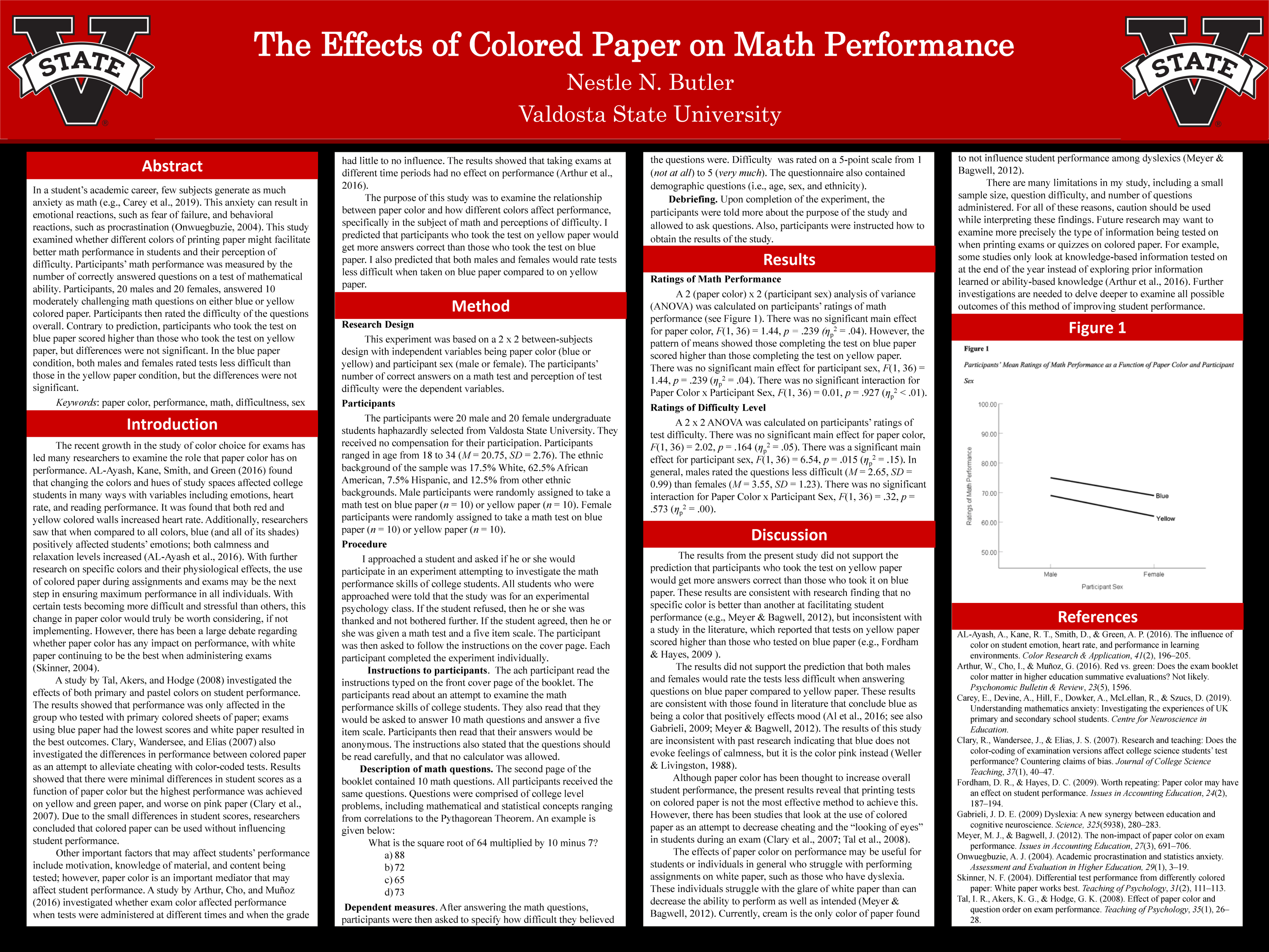 questions on a test of mathematical ability. Participants, 20 males and 20 females, answered 10 moderately challenging math questions on either blue or yellow colored paper. Participants then rated the overall difficulty of the questions. Contrary to prediction, participants who took the test on blue paper answered questions more correctly than those who took the test on yellow paper, but the differences were not significant. As predicted, in the blue paper condition, both males and females rated tests less difficult than those in the yellow paper condition, but the differences were not significant. The results have implications for individuals with learning disabilities, such as dyslexia, that find white paper distracting. Further research is warranted on how color impacts academic performance to facilitate optimal student performance.