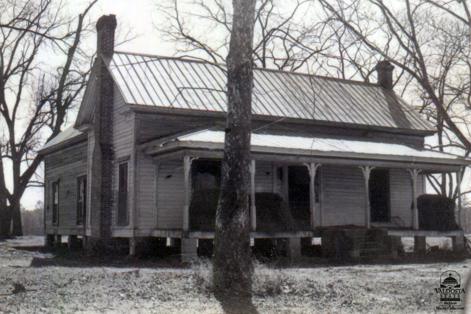 Georgia Architectural and Historic Properties Survey of Rural [075] Unknown, Lowndes Co. Ga. December 1980. 1 story rectangular dogtrot with gabled roof. Turned spindle posts with gingerbread trim support shed porch. Shiplap. Sidelights. Set on brick piers. Poor condition. Double hung sash windows with 2/2 lights. Date of Construction: c. 1890. Older rural house common to this area.